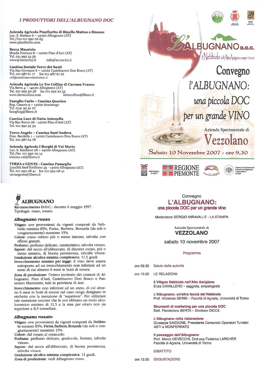 L'Albugnano: una piccola DOC per un grande vino è il titolo del convegno che si terrà sabato 10 novembre presso l'azienda sperimentale di Vezzolano per celebrare i dieci anni dal riconoscimento della denominazione di origine controllata del Nebbiolo dell'Alto Astigiano.